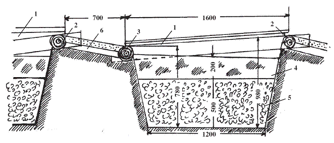 1 – парниковая рама; 2 – северный парубень; 3 – южный парубень; 4 – грунт; 5 – биотопливо; 6 – лежень (размеры – в мм)
