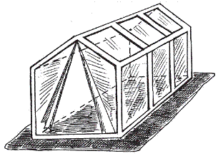 Укрытие шатрового типа. Каркас изготавливают из брусков сечением 3×3 см и длиной 1–1,2 м и конькового бруса. Бруски соединяют при помощи гвоздя или болта и заглубляются в землю на 20–25 см. Такие козелки устанавливают через 2–3 м и на них укрепляют коньковый брус. Пленку укладывают на козелки, а внизу прикапывают. Вентилируют сооружение, поднимая пленку вдоль укрытия и на торцах.