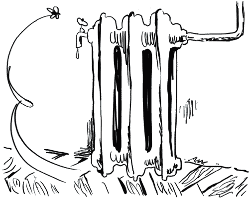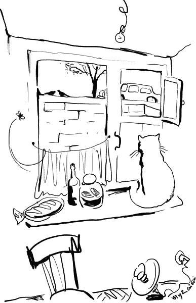 Вадя долгим изучающим взглядом внимательно глядит в угол, на мусорное ведро. Слышно густое жужжание мухи…