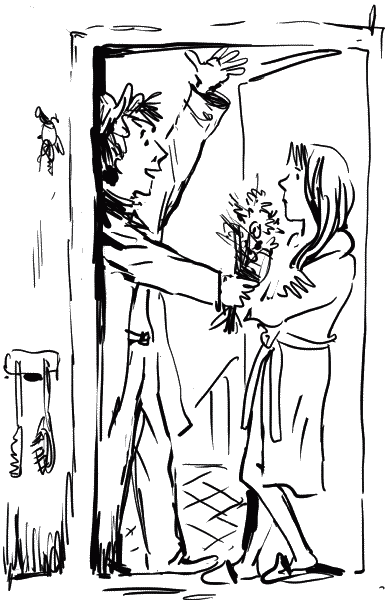 Идет открывать. Прихожая видна со стороны зрительного зала. Люба же слышит только голоса. Вера открывает дверь. На пороге – Вадя, пьяненький, с цветочком.
