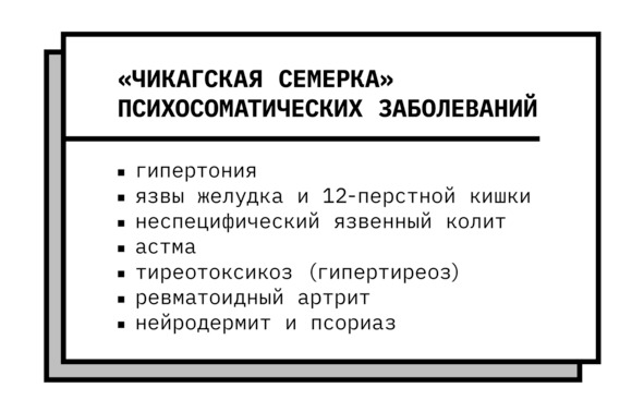 Есть и заболевания, которые чаще прочих относят к психосоматическим. Это так называемая «чикагская семерка», которую еще в середине XX века выделил американский психоаналитик Александр Франц: