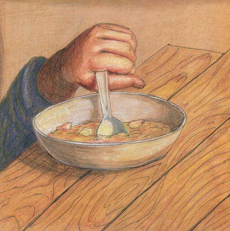 – А ну, не спеши, жуй подольше – бурчала старуха, вытирая род мальчику и подбирая падающие у него крошки от хлеба, закинув их себе в рот. Малыш с жадностью глотал суп, не прожевывая.