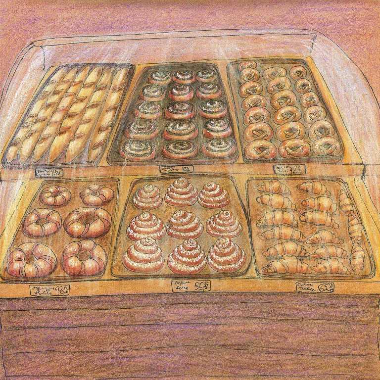 На витрине «Булочной» лежали разные красивые булочки, посыпанные сахарной пудрой. Казалось, их нельзя было есть, а только лишь любоваться. Ванильный аромат булочек опьянил старушку и мальчика, они, застыв на месте, не моргая, смотрели на них.