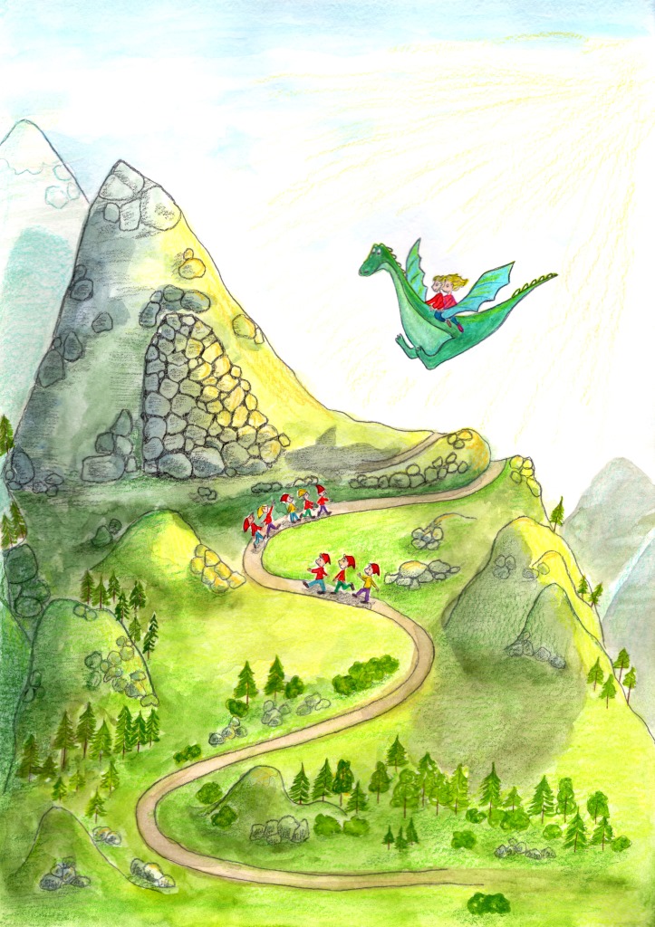 Милли и Томи сели на Даки и он скорей полетел к высокой горе, где в заточении сидел ветерок Юкки.