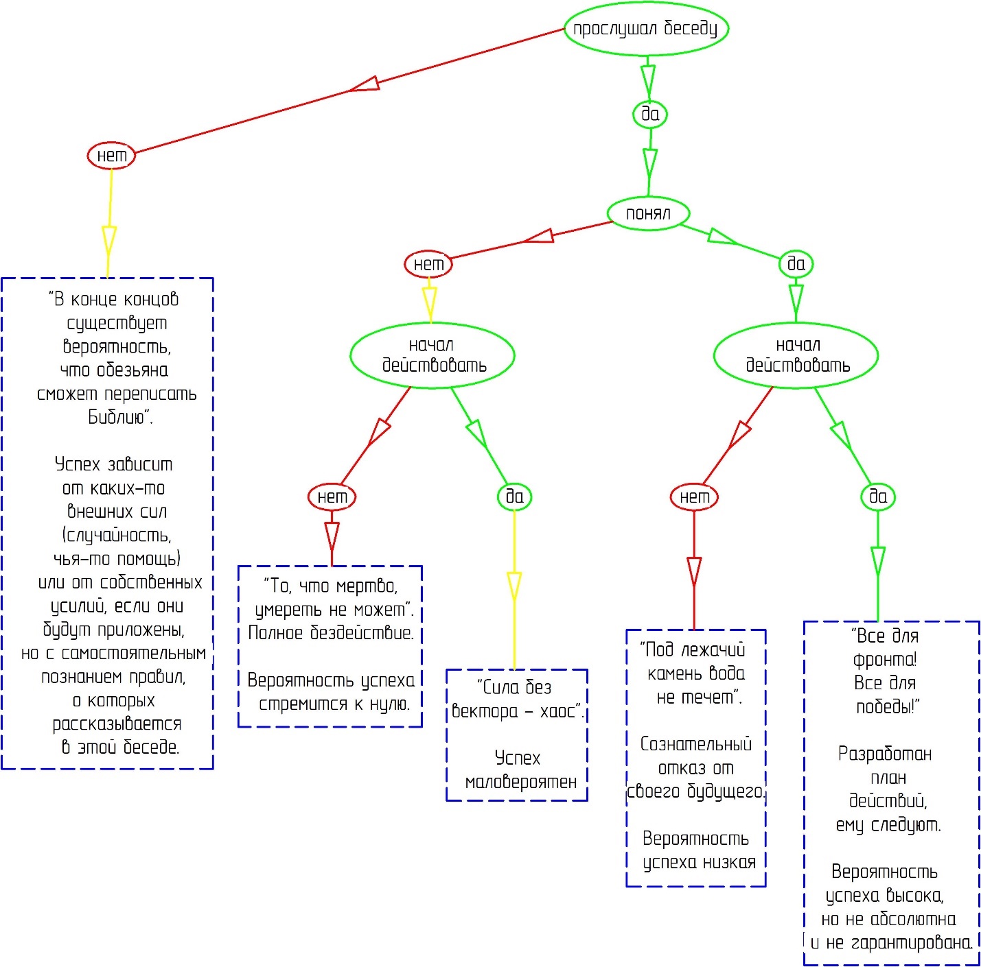 Смысл этой схемы я свожу к тому, что помимо простого прослушивания беседы, важно еще и понять, что же все-таки делать и как составить план действий. Но вот что важно: перечисленное совершенно не гарантирует этот самый успех. Оно лишь увеличивает шансы его приближения, в отличие от полного бездействия либо же хаотичных попыток сделать хотя бы что-то.