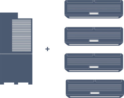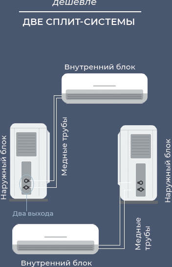 Ее отличие от сплит-системы состоит в том, что к одному внешнему блоку подключаются не один, а несколько внутренних блоков: обычно от 2 до 6 штук. От каждого внутреннего блока кондиционера до внешнего прокладываются отдельные коммуникации.