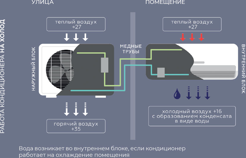 Влага появляется в кондиционере из насыщенного ею воздуха. Воздух, проходя через кондиционер, направляется через холодный теплообменник. На холодном теплообменнике скапливаются капельки воды. Такой же эффект мы наблюдаем, когда достаем банку прохладительного напитка из холодильника – она сразу покрывается инеем, а потом иней превращается в капельки влаги. Воздух, который прошел через кондиционер, подсушивается.