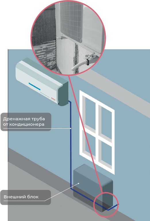 На улицуСливная труба прокладывается от кондиционера в помещении к уличному блоку, где обычно крепится к кронштейну. Минусом такого способа является шум, который может возникнуть от сильного ветра, так как трубка является воздушным каналом. Управляющая компания не всегда согласовывает такой вариант в жилых комплексах из-за того, что капли с шумом попадают на подоконники соседей, живущих ниже.