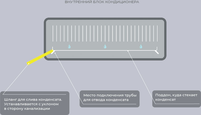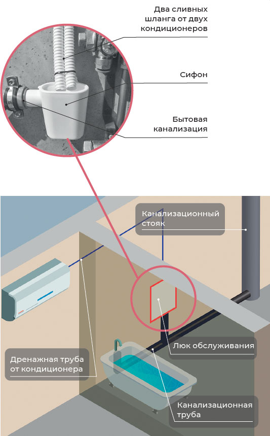 Сливная труба прокладывается от кондиционера в помещении до бытовой канализации, где подключается через специальный сифон, который предотвращает попадание запаха из канализации в кондиционер. Сифон должен находиться в зоне обслуживания, так как требуется периодическая очистка.