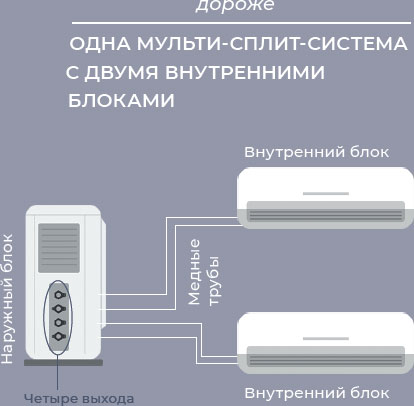 Чаще всего стоимость внешнего блока мульти-сплит-системы дороже двух отдельных внешних блоков сплит-системы. Это связано с тем, что мульти-сплит система имеет более сложные модули управления, дополнительные клапаны и датчики для раздельного включения внутреннего блока.