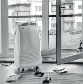 Мобильный кондиционер – это кондиционер, который можно перекатывать из комнаты в комнату. Минусами являются шумность работы и шланг, который нужно выводить на улицу для отвода теплого воздуха.