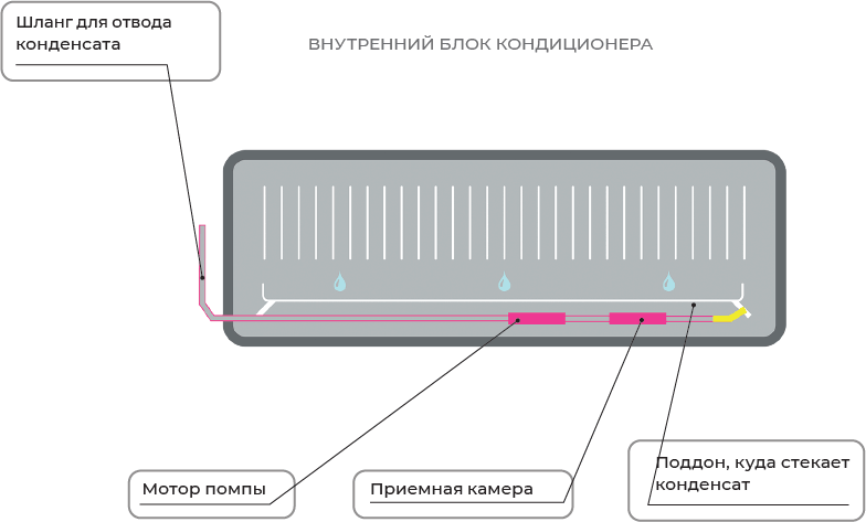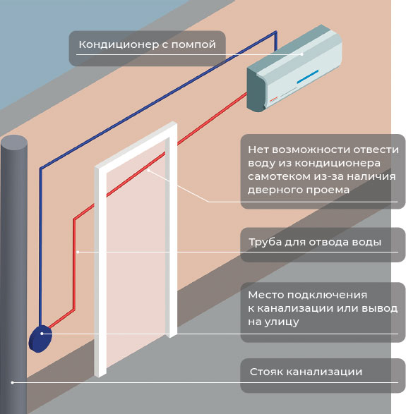 Помпа – это насос. Помпу приходится устанавливать в тех случаях, когда нет возможности отвести воду самотеком из кондиционера. Например, если трубка отвода конденсата не может пройти над дверью.