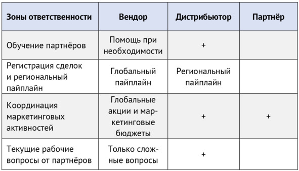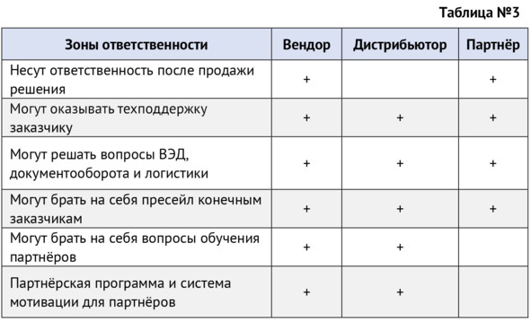 В совместном бизнесе вендоров, дистрибьюторов и партнёров зоны ответственности могут быть распределены по-разному (см. таблицу №3).
