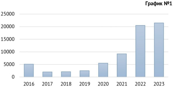 Эта же динамика хорошо видна по графику официального приёма заявлений на включение в реестр различных программных и программно-аппаратных решений (замечание автора: приём заявления не означает автоматическое добавление в реестр). На графике явный всплеск заявок, который произошёл именно в 2022-м году, увеличившись практически в 2 раза от показателей 2021-го года. И объём заявок сохранился почти на том же уровне в 2023-м году (см. график №1).