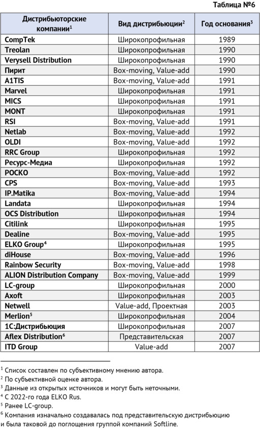 Список наиболее значимых ИТ-дистрибьюторов в истории Российской Федерации приведён в таблице №6.