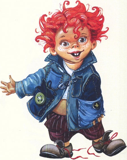 The bunnies’ other guest, the red-haired baby boy doll Pookar, belonged to the type that always walks around with undone laces, scraped knees, and a black eye. His red hair was tousled, his turned-up nose looked at the world with two cheerful holes, and freckles were scattered across his cheek.