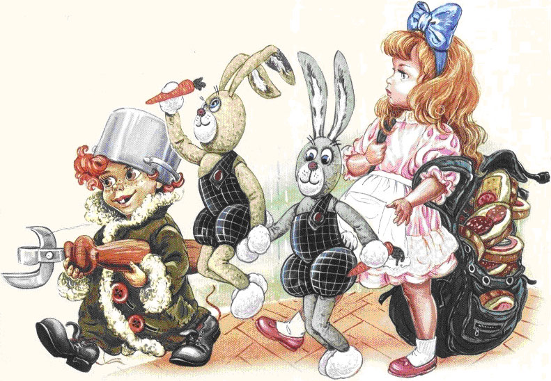 Then the friends took to the field. Pookar, with the bottle-opener in hand, stepped in front. Behind him hopped the bunnies. The doll Olga brought up the rear, loaded with a backpack of sandwiches.