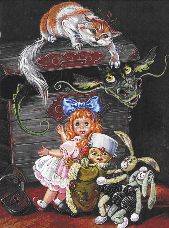 Nothing happened, only dust whirled around in the corners. Pookar got up on his toes and reached for the doorknob. The door creaked. The toys went inside. The bunnies hung on firmly to the doll Olga’s dress and pulled with all their strength, they were so scared.