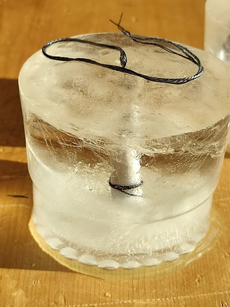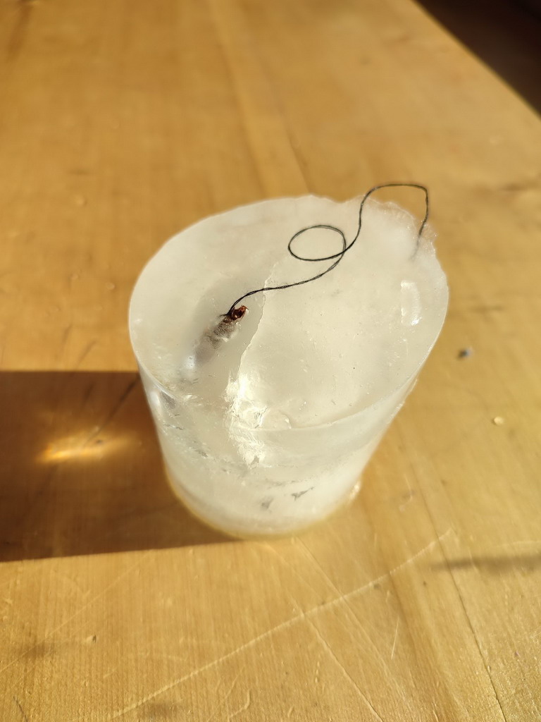 Теперь записку надо свернуть в рулончик, чтобы нельзя было разглядеть подсказку сквозь льдинку. Рулончик удобно обмотать ниткой (фото ниже).
