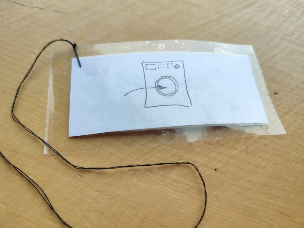 А чтобы лёд можно было бы куда-то подвесить, нужна верёвочка или нитка. С помощью иголки пришиваем её к подсказке.
