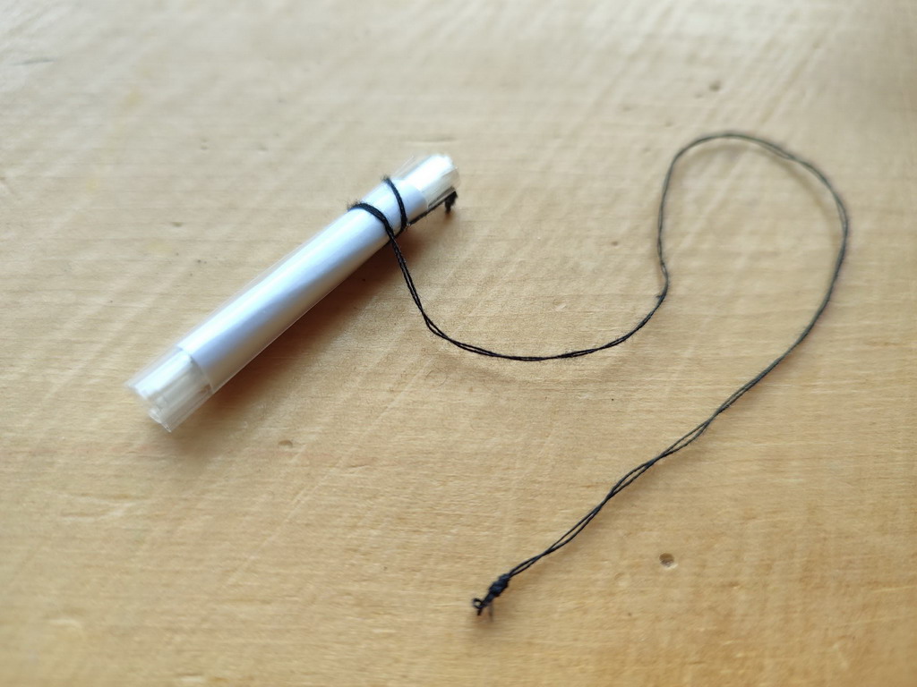 Во втором дубле иглу использовали длинную, чтобы было удобно продевать сквозь рулончик. Нитку-ось взяли потолще, чтоб подсказка по ней не скользила. Прокол на дне стаканчика снизу залепили куском пластилина для герметичности.