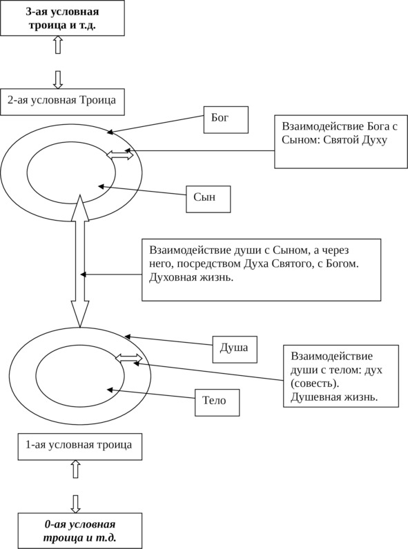 Душа 1- ой условной троицы – это Бог для 0-ой условной троицы при «жизни» 0-ой и 1-ой условной троицы, либо по «смерти» 1-ой условной троицы тело 2-ой условной Троицы;