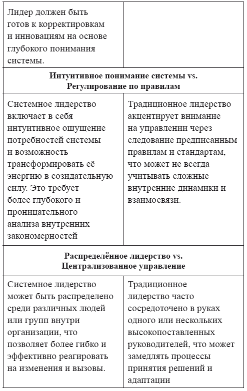 Системный подход к лидерству устраняет привычные границы между старым и новым, большим и малым, иерархическим и плоским, ярким и незаметным. Он предлагает выйти за пределы этих разграничений, позволяя одновременно следовать и против течения, и по нему.