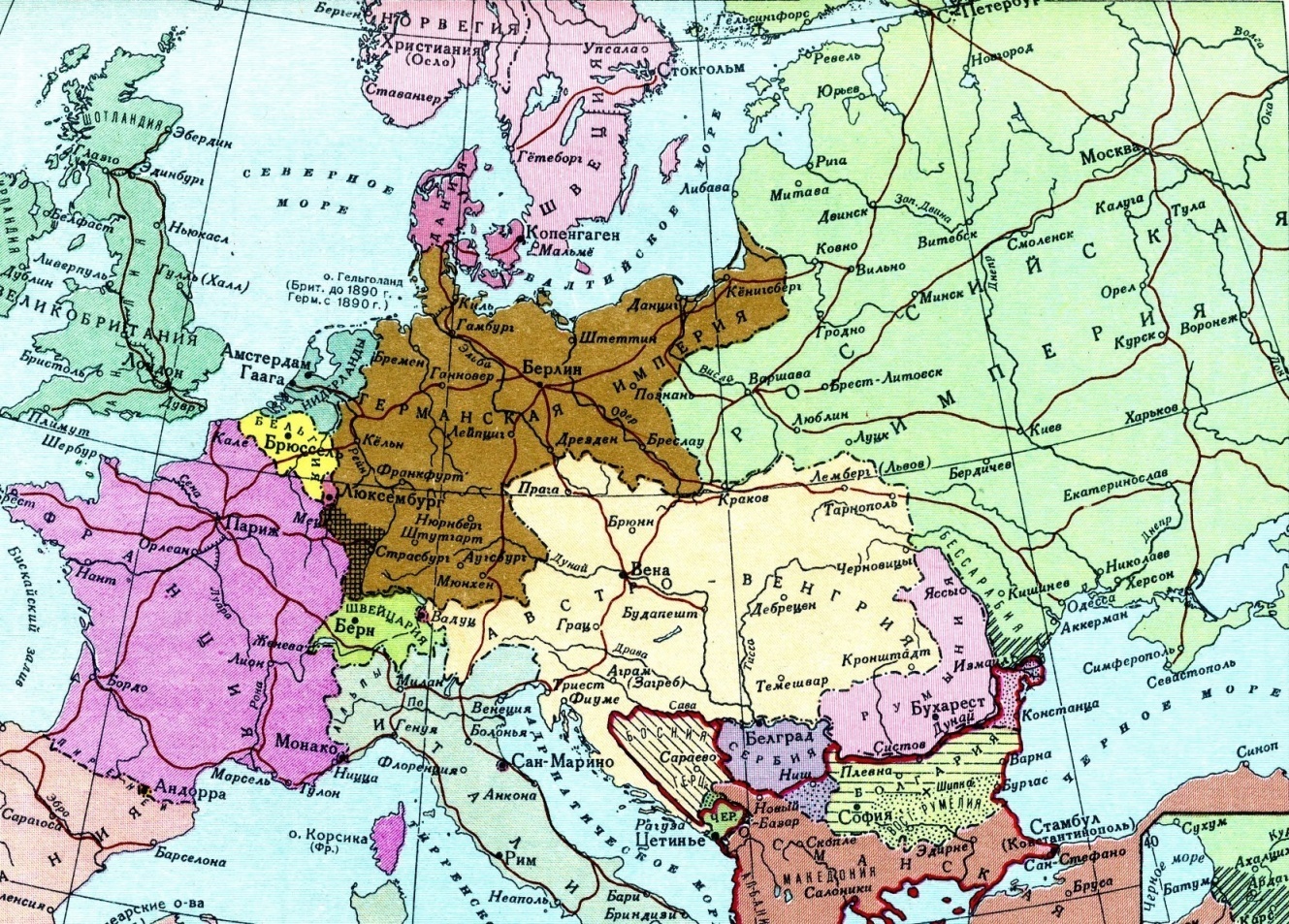 Значит, разделяй и властвуй. Австрию и Россию хитро поссорили через балканский вопрос после русско-турецкой войны 1877-1878 годов. Англия и Франция инициировали Берлинский конгресс, где наобещали Австро-Венгрии Боснию и Герцеговину (заштрихована на карте), взамен на голос против позиции России. А Германия поддержала своего единокровного союзника (Австрийцы – те же немцы). В итоге, к восьмидесятым годам из-за взаимных претензий, Союз трёх императоров распался. Точнее, из него вышла Россия. Германия и Австрия продолжили дружить. Франция и Англия технично притянули Россию к себе в союз.
