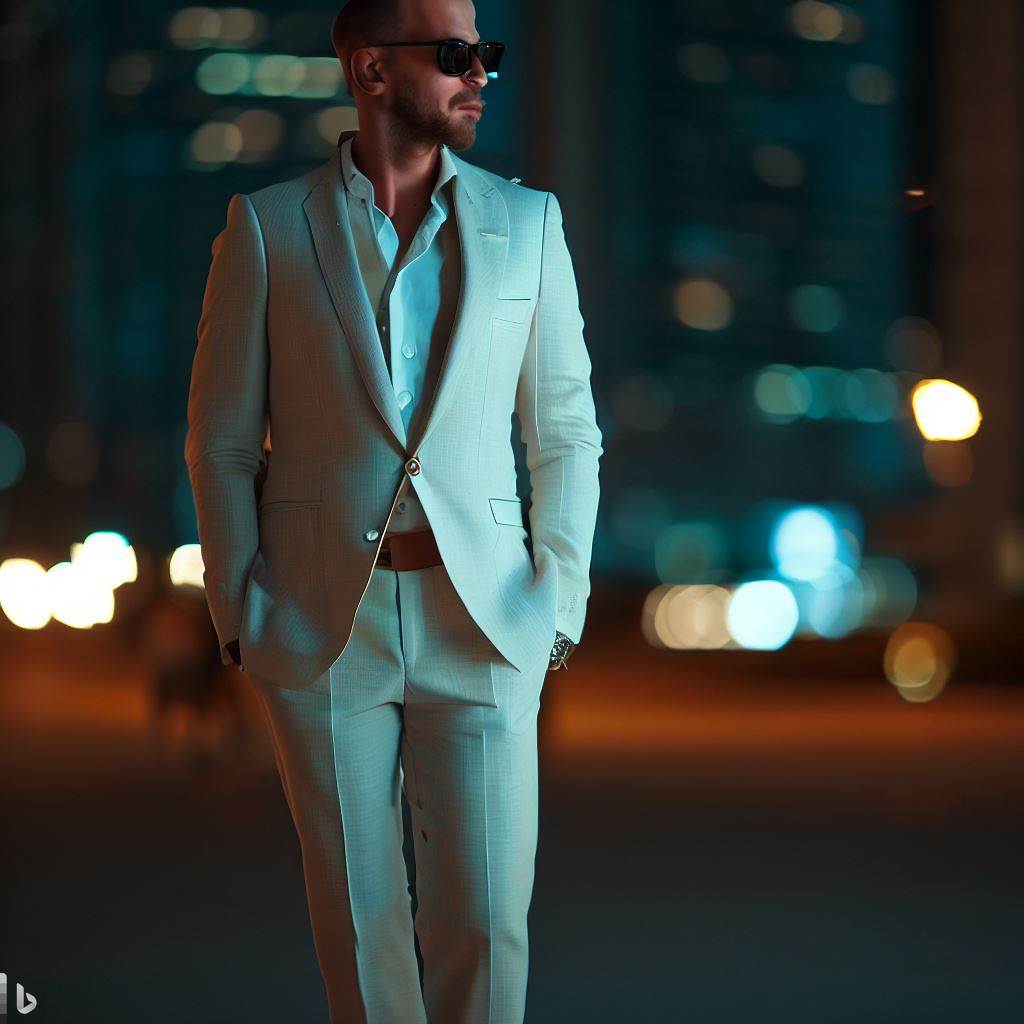 По случаю он оделся в лёгкий светлый костюм, лёгкие мокасины и тёмную майку вместо сорочки.