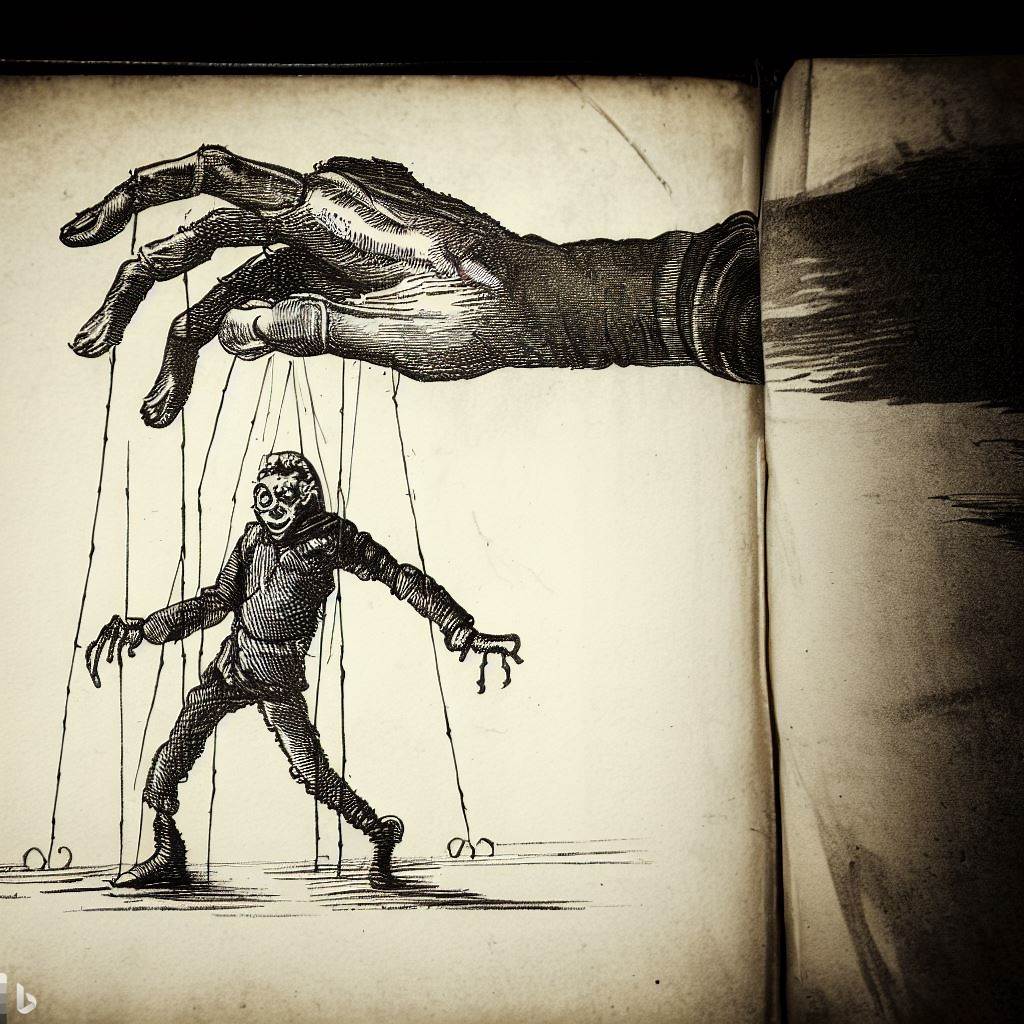 В хрустальном ларце, покрытым прозрачным сапфировым стеклом лежала та самая книга, раскрытая на странице с искусно выполненной, но слегка зловещей иллюстрацией. Когтистая лапа кукловода, держала на нитях измученного человека.