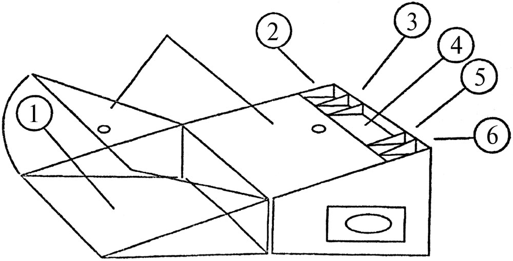 Крышка ящика для письменных принадлежностей (1) сделана таким образом, что в полностью открытом виде образует с самим ящиком наклонную плоскость, состоящую из двух частей и покрытую сукном. Ею можно пользоваться как письменным столом. Ее длина в два раза превышает длину самого ящика, которая составляет около 54 сантиметров.