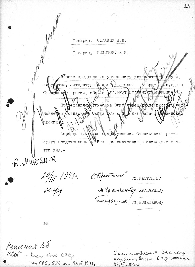 Ил. 1. Записка С. Кафтанова, М. Храпченко и И. Большакова с предложением об установлении для деятелей науки, искусства, литературы и изобретателей, которым присуждены Сталинские премии, звания «Лауреат Сталинской премии», 20 марта 1941 г. // РГАНИ. Ф. 3. Оп. 53а. Ед. хр. 1. Л. 28.