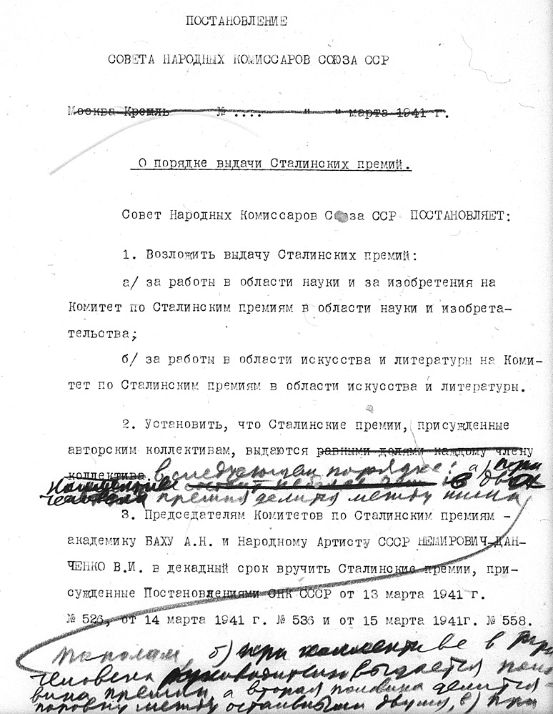 Имея в виду большое политическое значение, какое будет иметь присуждение премий им. товарища Сталина за лучшие произведения 1940 года, представить Комитету по Сталинским премиям при СНК СССР одну лишь кандидатуру – кандидатуру тов. Шолохова и роман его «Тихий Дон», окончание которого приходится на 1940 г.