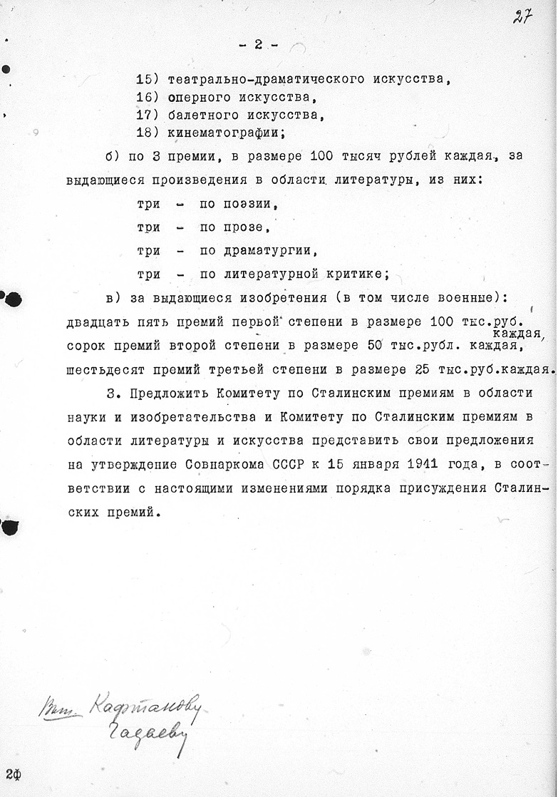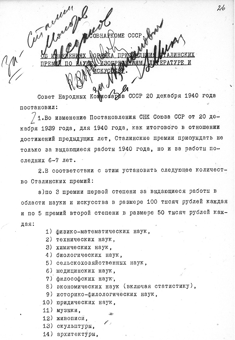 За день до утвержденной даты публикации в центральной печати постановления о присуждении Сталинских премий, 20 декабря 1940 года, Совнарком СССР во главе с В. М. Молотовым неожиданно для всех принял постановление № 2600 «О присуждении Сталинских премий по науке, искусству и литературе»301, итоговый вариант которого был опубликован в «Правде» почти три недели спустя (12 января 1941 года)302.