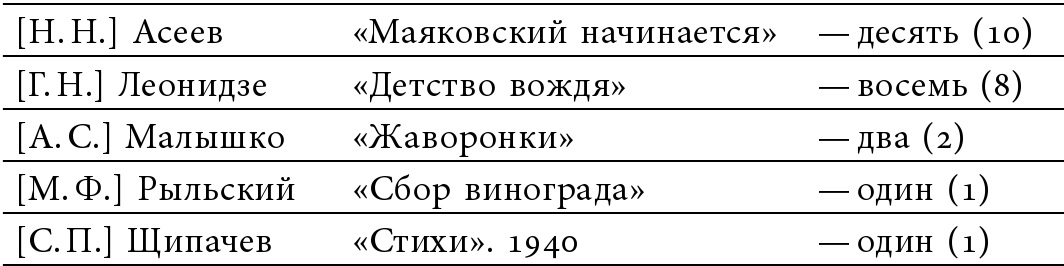 отклоненные: «Страна Муравия» (опубл. в 1936) А. Т. Твардовского; «Стихи» (опубл. в 1935) С. Вургуна; «Детство вождя» (пер. с груз. Н. Тихонова; впервые опубл. под заглавием «Сталин. Детство и отрочество» в 1940) Г. Н. Леонидзе; «Бессмертье» (опубл. в 1935–1937) Н. П. Бажана; «Стихи» (пер. с груз. под ред. В. Гольцева; опубл. в 1935) С. И. Чиковани; «Тень друга» (опубл. в 1936) Н. С. Тихонова; «Великий перелом»317 П. Д. Маркиша; «Царицынская эпопея» (опубл. по-русски под заглавием «Книга о богатырях» в 1940) Н. Зарьяна; а также ряд других текстов, среди которых песни М. В. Исаковского318, стихи А. С. Исаакяна319, Л. М. Квитко320, С. И. Кирсанова321, А. Д. Кушнерова322, С. В. Михалкова323, детские стихи С. Я. Маршака324.