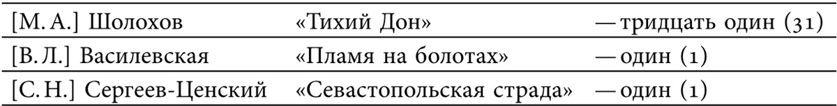 одобренные: «Тихий Дон» (опубл. в 1928–1940) М. А. Шолохова; «Педагогическая поэма» (опубл. в 1933–1935) А. С. Макаренко; «Севастопольская страда» (опубл. в 1939–1940) С. Н. Сергеева-Ценского; «Гвади Бигва»311 (пер. с груз. Е. Гогоберидзе; опубл. в 1940) Л. Киачели;