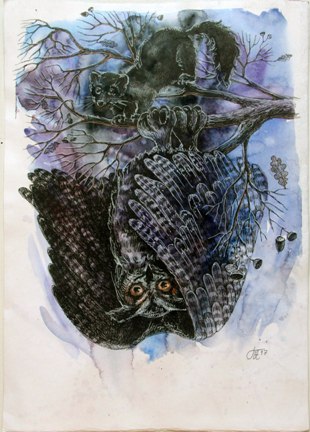 – Привет, – сказал зверёк и перепрыгнул на ветку, где сидел филин. Только теперь он обнаружил, что филин висит на суку кверху ногами, похожий на большое осиное гнездо, и с этой стороны ветки только его толстые пальцы с сильными когтями. – Почему ты висишь кверху тормашками?