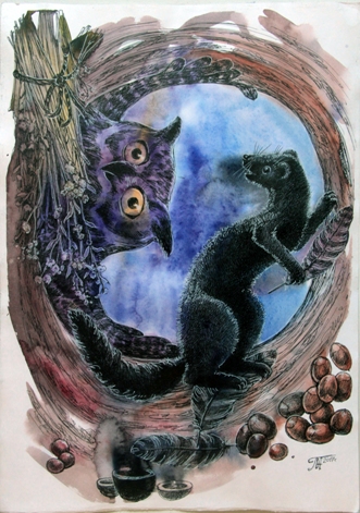 Зверёк забрался наверх и обнаружил, что нет ни одного листика и даже ни одного жёлудя, чтобы подкрепиться. Это очень его расстроило. Зато он нашёл укутанную с лап до головы в перья фигуру, которая оказалась филином.
