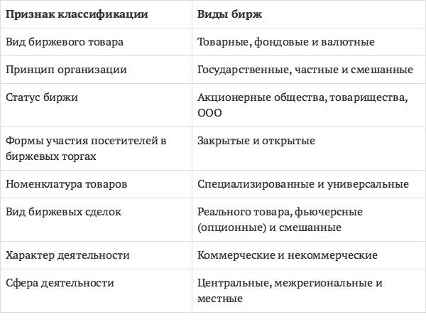 Виды бирж по признакам классификации