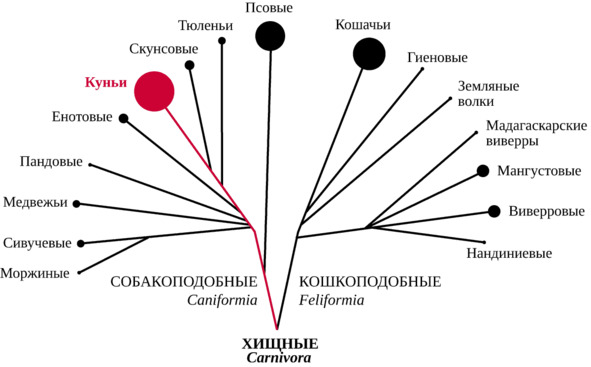 Отряд хищных млекопитающих (Carnivora) объединяет два подотряда: собакоподобные (Caniformia) и кошкоподобные (Feliformia) хищники. Эти подотряды сформировались в эоцене-олигоцене: начало собакоподобным хищникам дали древние куньи (Mustelidae), а кошкоподобным – виверровые (Viverridae) (Рожнов, 2011). Согласно последней сводке, ныне живущие куньи объединяют 46 видов (в России встречается 18—19) и являются самым многочисленным семейством в отряде хищных млекопитающих (Аристов, Барышников, 2001; Wozencraft, 2005). Ближайшими родственниками куньих являются скунсы, еноты и тюлени (рис. 1).