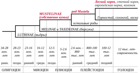 Куньи – достаточно древнее семейство: первые его представители обнаружены в раннем олигоцене (34—28 млн. лет назад). Семейство делится на четыре подсемейства: собственно куньи (Mustelinae), выдровые (Lutrinae), барсучьи (Melinae) и американские барсуки (Taxidiinae). Исторически из семейства куньих сначала выделились выдры, затем – барсуки, а в раннем плейстоцене (2.6—0.8 млн. лет) уже полностью оформились существующие ныне подсемейства (Гептнер и др., 1967; Рожнов, 2011) (рис. 2).