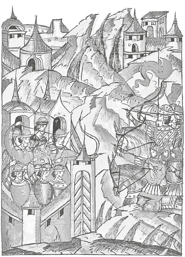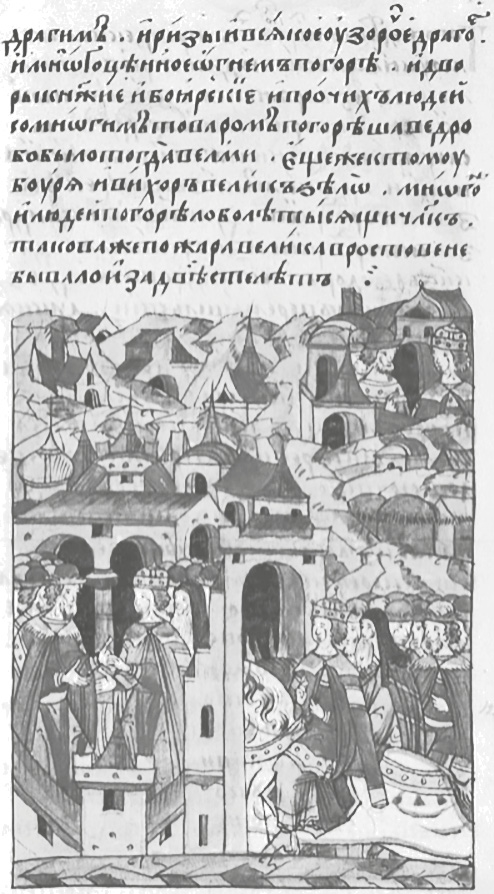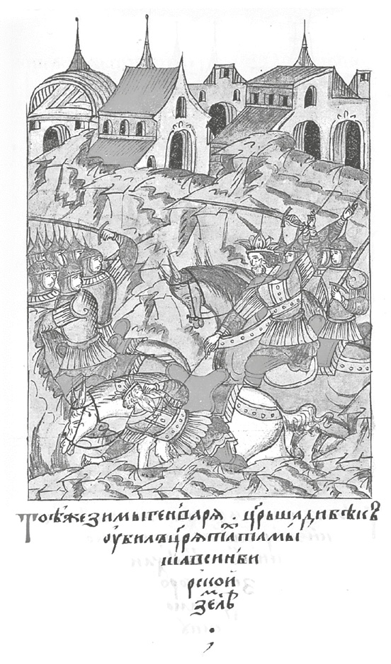 Убийство ханом Шадибеком Тохтамыша в Сибирской земле. Миниатюра Лицевого летописного свода XVI в.
