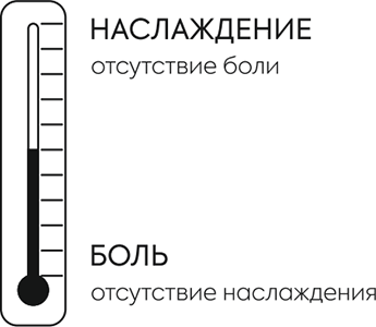Боль бывает приятная, терпимая, нетерпимая и несовместимая с жизнью. На рисунке мы видим шкалу. Градусы показывают интенсивность боли, которая ощущается по-разному. Обратите внимание: боль может ощущаться как наслаждение. Например, массаж или баня могут вызвать приятную боль, за которой следует облегчение. Такую боль мы терпим осознанно, мы даже стремимся ее ощутить, зная, как потом будет хорошо. В любом случае ощущения у разных людей будут разными.