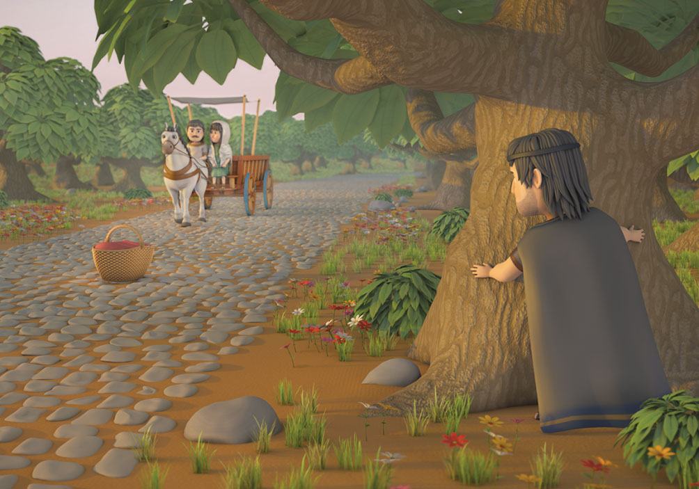 Начало светать, подошел он к лесу и увидел вдалеке медленно приближающуюся к нему какую-то повозку, поставил корзинку посреди дороги, а сам спрятался за деревья и стал ждать. В телеге, запряженной белой лошадью, с поднятым тентом из ткани сидели двое: мужчина и женщина.