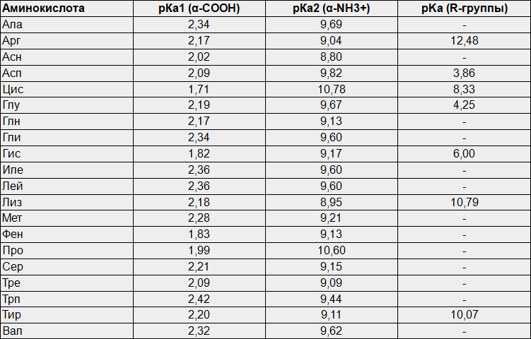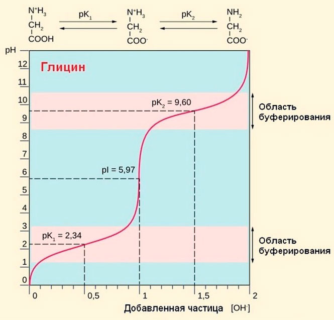 Аминокислоты являются амфолитами, для которых характерно наличие рКа1 (α-COOH), pКа2 (α-NH3+). Например, для глицина это значения 2,34 и 9,5. Это легко установить методом кислотно-основного титрования (см рис.)