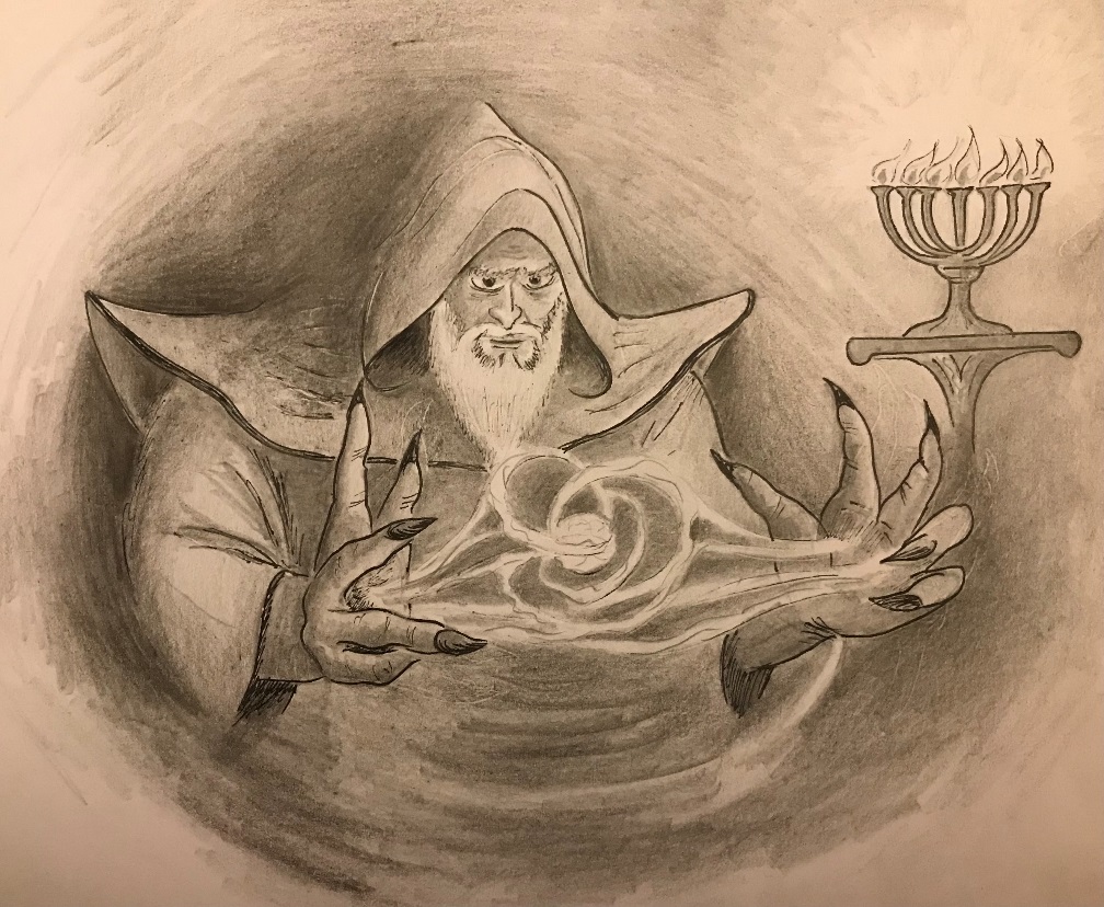 Пред огнем свечей, числом семеро, в круге тёмном, почти невидимы, восседали фигуры сущностей, чуждых Свету и Совести, с именами неведомыми, звуком-тоном такими тяжкими, что звучать на Земле им немыслимо.