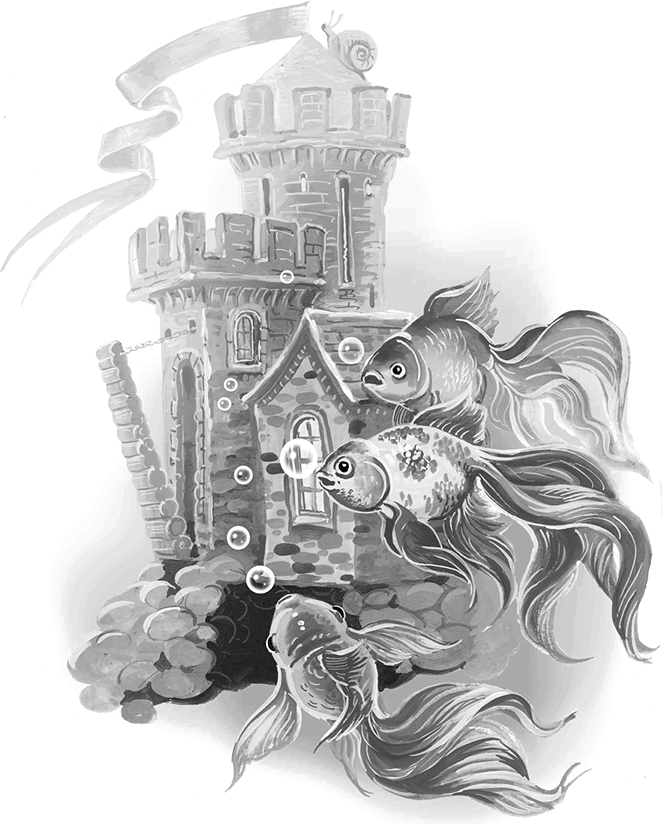 На дне аквариума стоял замшелый замок-башня – с бойницами, с окошками, с подъёмным мостом. У стен замка плавали золотые рыбки с вуалевыми хвостами.