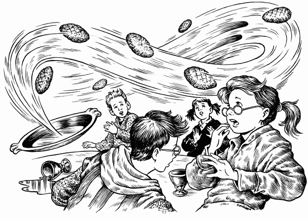 Никто не ответил. Это и так было очевидно. Все стояли и смотрели вверх. Вскоре, снижаясь по спирали, над озером появилась длинная деревянная скамья. С одного ее края сидела Медузия, с другого – Великая Зуби. Между ними мелькали детские головы. Дети сидели, вцепившись в скамейку, и со смесью страха и любопытства озирались по сторонам.