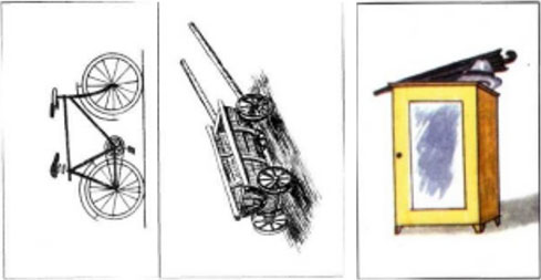 На первом этапе больной объединяет в шкаф, тележку и велосипед, объясняя это тем, что телега катается и велосипед катается, в шкаф можно положить вещи и в телегу можно. Телега объединяет их. Она идеальна.