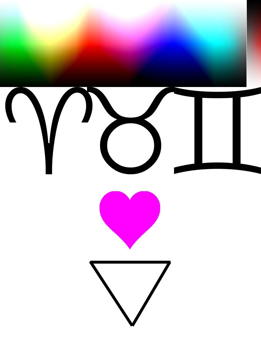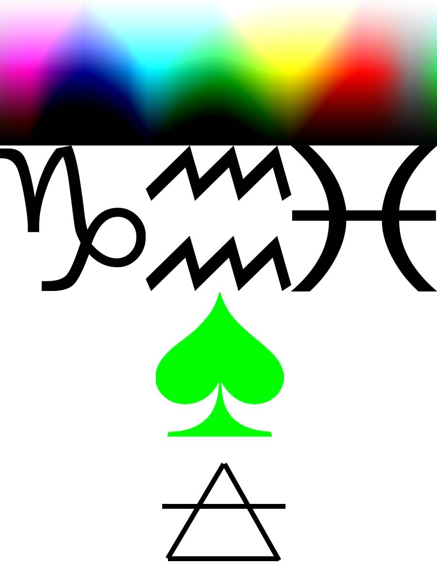 Я располагал 4 части возможных комбинаций направления и внутреннего следования цветов, так что бы можно было получить в них очертания и смысл 12 знаков зодиака. Здесь я хочу предупредить читателя, что сейчас весь скепсис, если он есть, по поводу астрологии, нужно приберечь до главы «Астрология», здесь же нам нет никакой необходимости верить в астрологию, нужно просто посмотреть на некоторые совпадения. А явственность этих совпадений безусловно зависит цветовой модели, здесь всё в RGB-цветах, а в иных моделях получается иначе. Но давайте, на секундочку допустим, что древние и не очень древние оккультисты видели внутренним взором, либо как-то оптически получали эти изображения, и, обводя их контуры, получали некоторые символы. Вспомним хотя бы Исаака Ньютона, который почти открыл Малый Порядок Эманаций, но из-за стремления свести всё к семи категориям, неправильно понял своё открытие. Чисто гипотетически посмотрим на наложение где-то стройно, а где-то не очень, Знаков Зодиака и других символов: